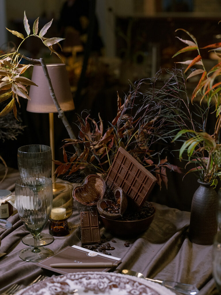 Centerpieces were a feast for the senses. Beyond the lush florals, each table featured coffee beans, real chocolate bars, and fresh fruit, reinforcing the chocolate theme while engaging sight, touch, and scent. These details created an immersive experience, allowing guests to indulge in the theme in a tangible, playful way.
