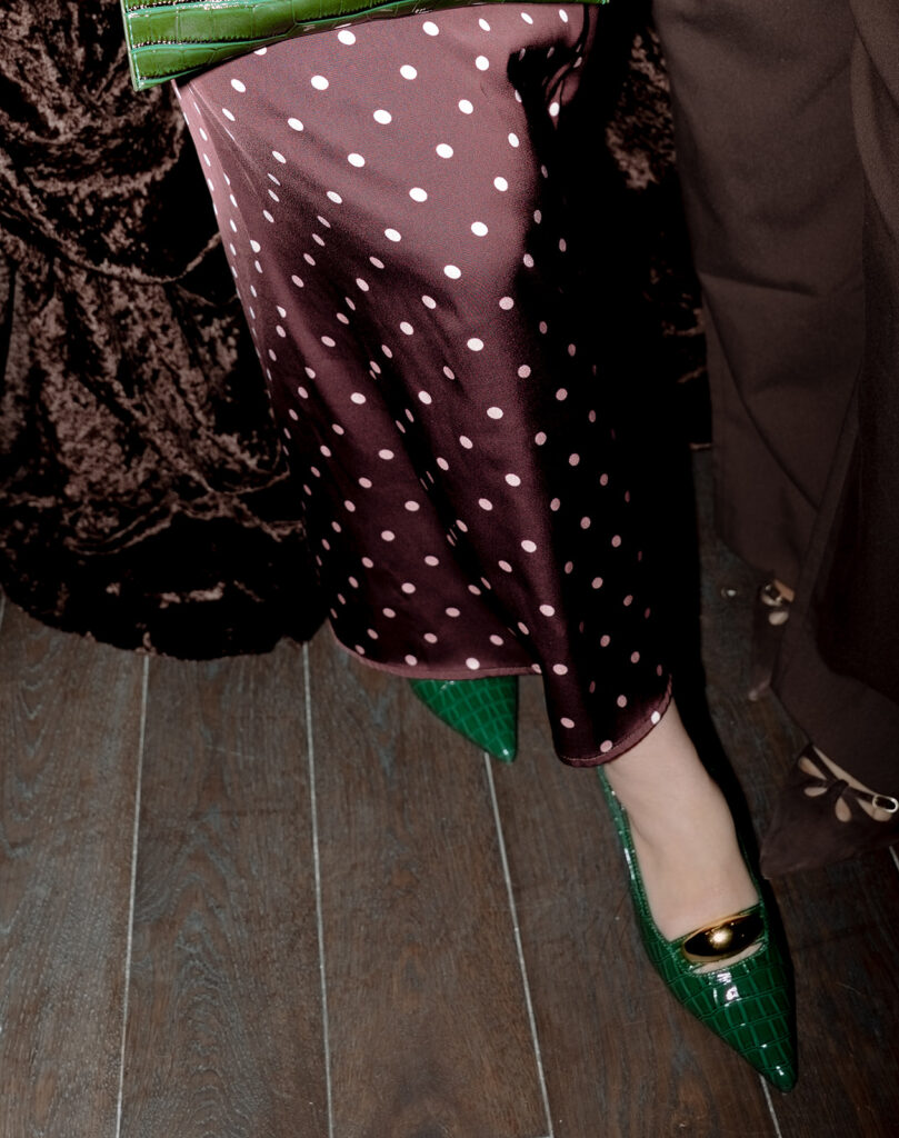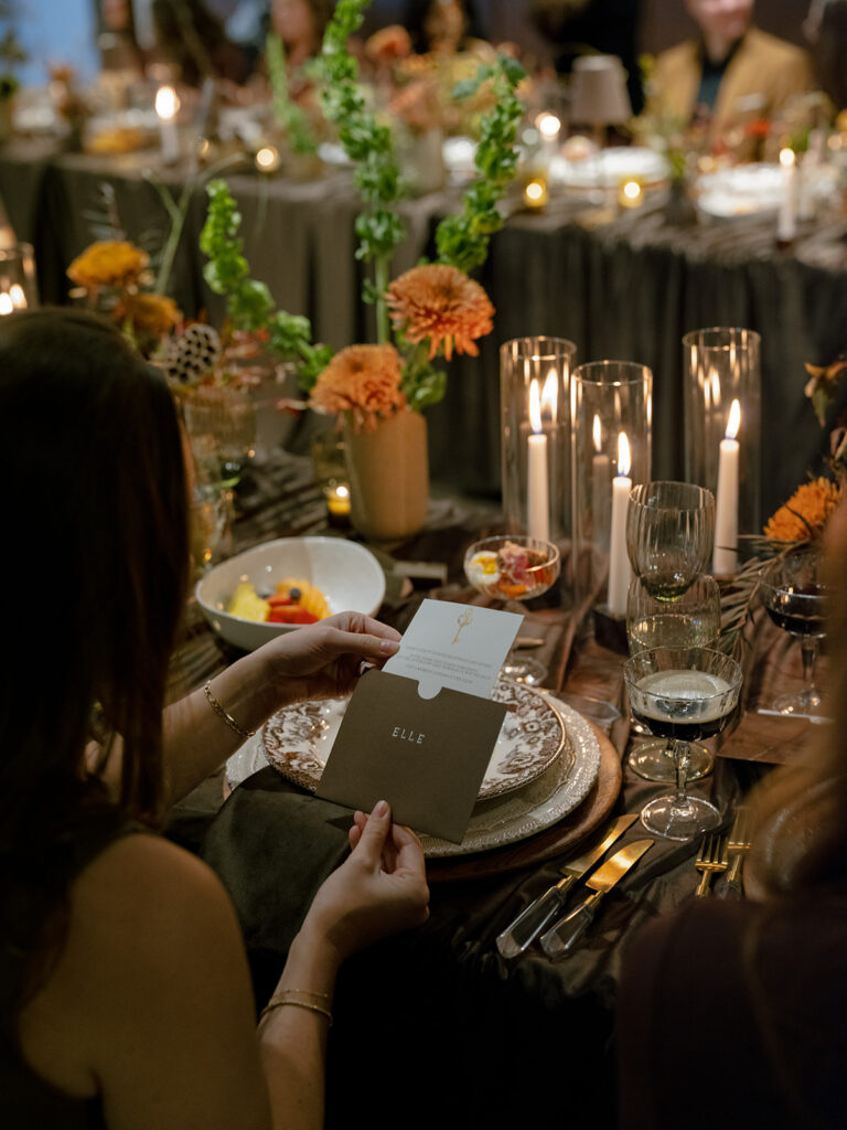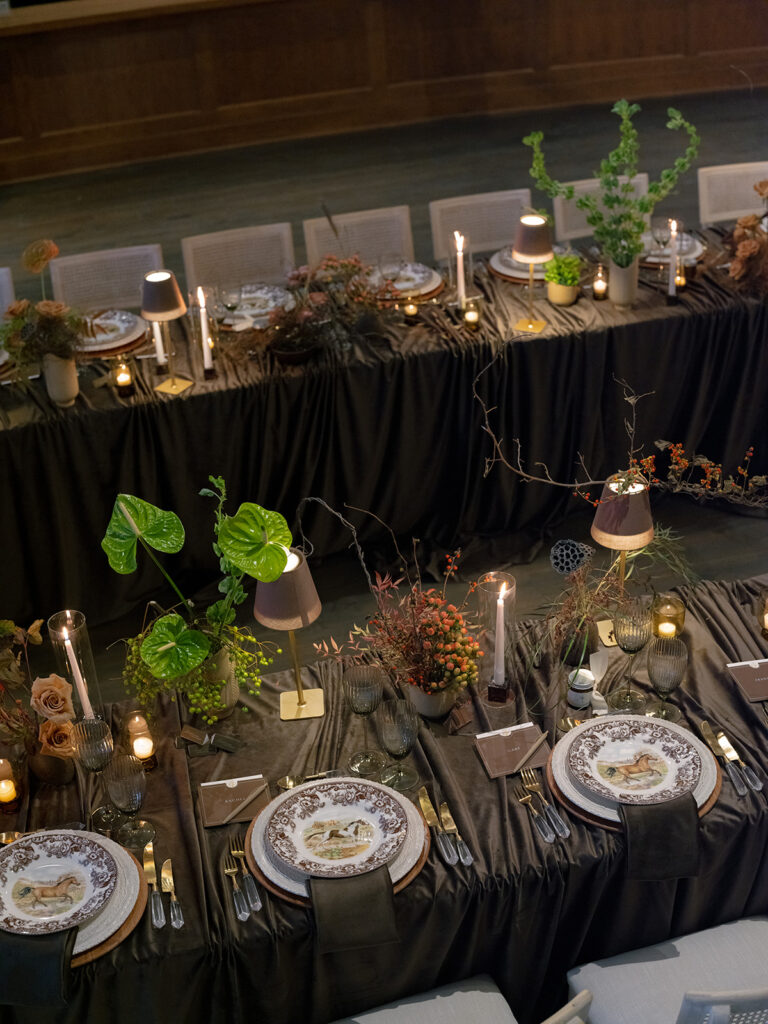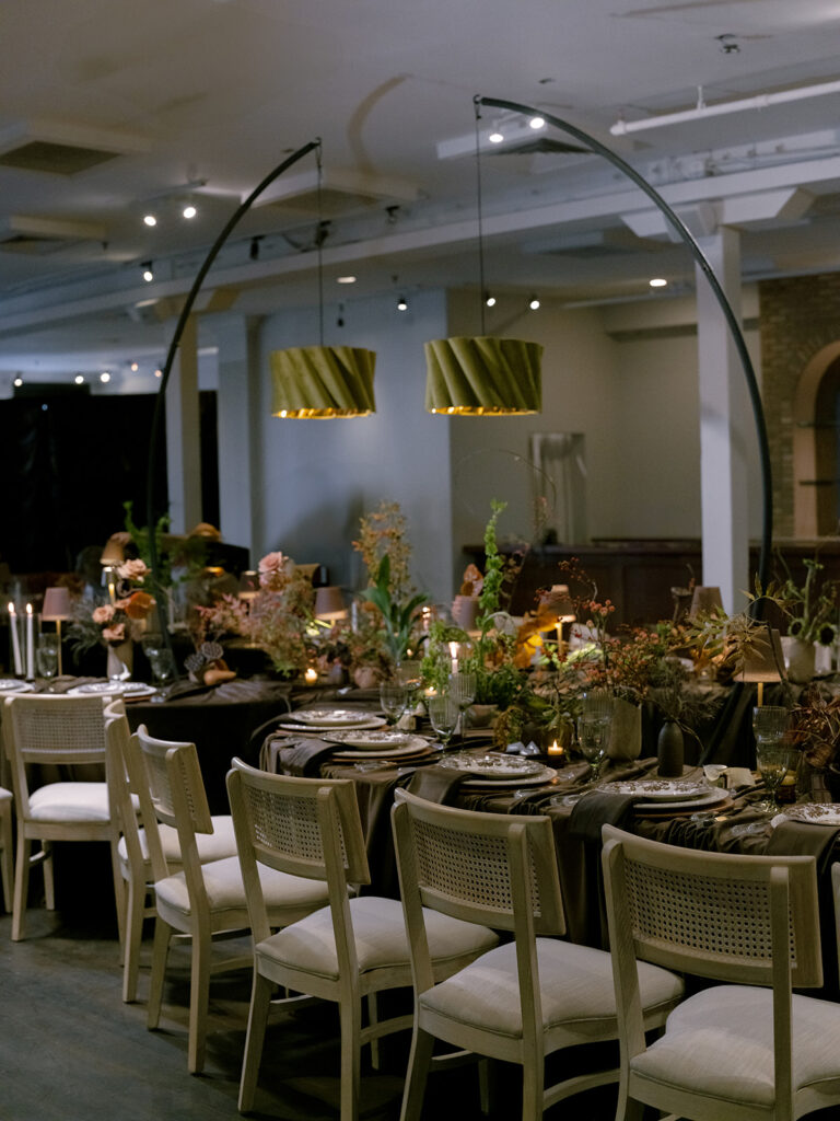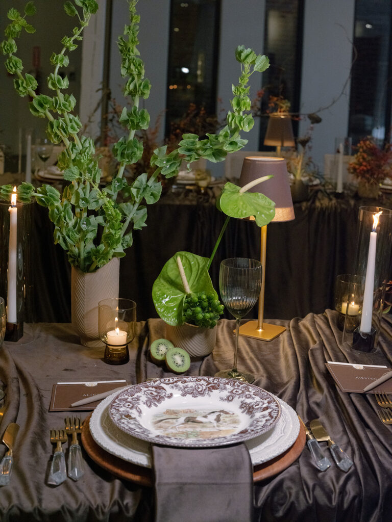 The design centered around monochromatic chocolate brown, creating a cohesive and luxurious base that immediately enveloped guests in warmth. To bring energy and contrast to the space, the floral arrangements introduced unexpected pops of chartreuse and coral, adding a vibrant, fresh touch that beautifully punctuated the deep brown tones.