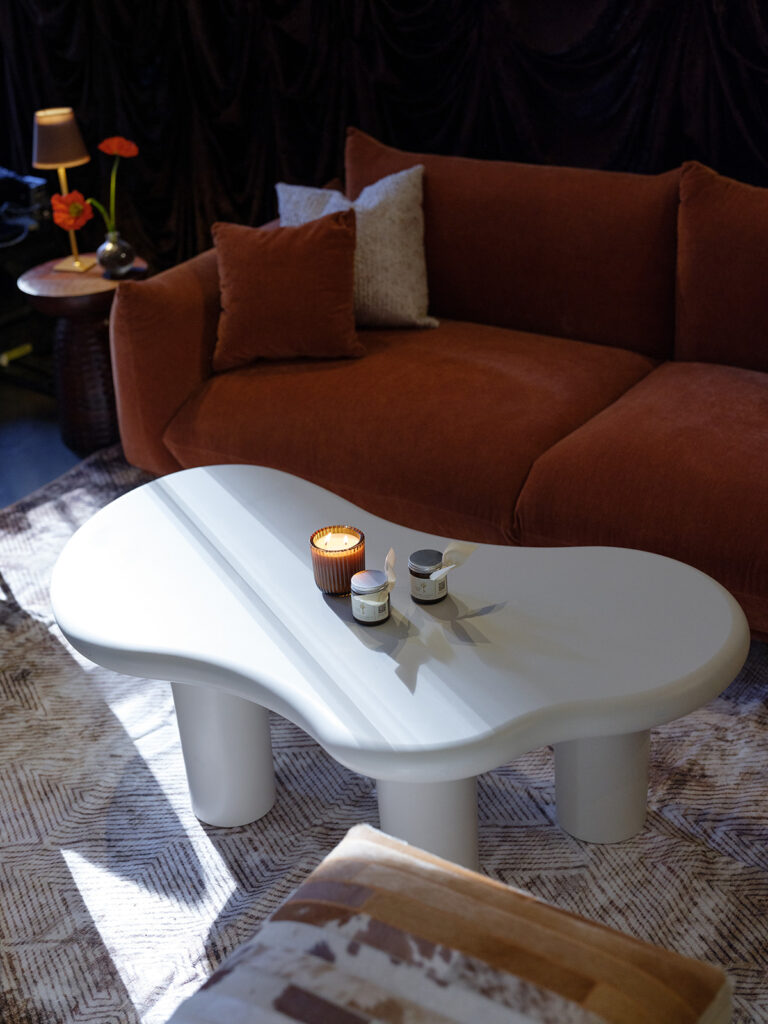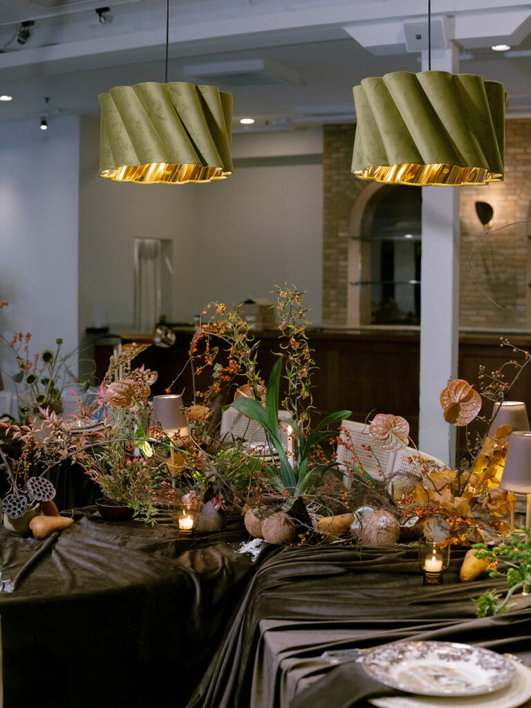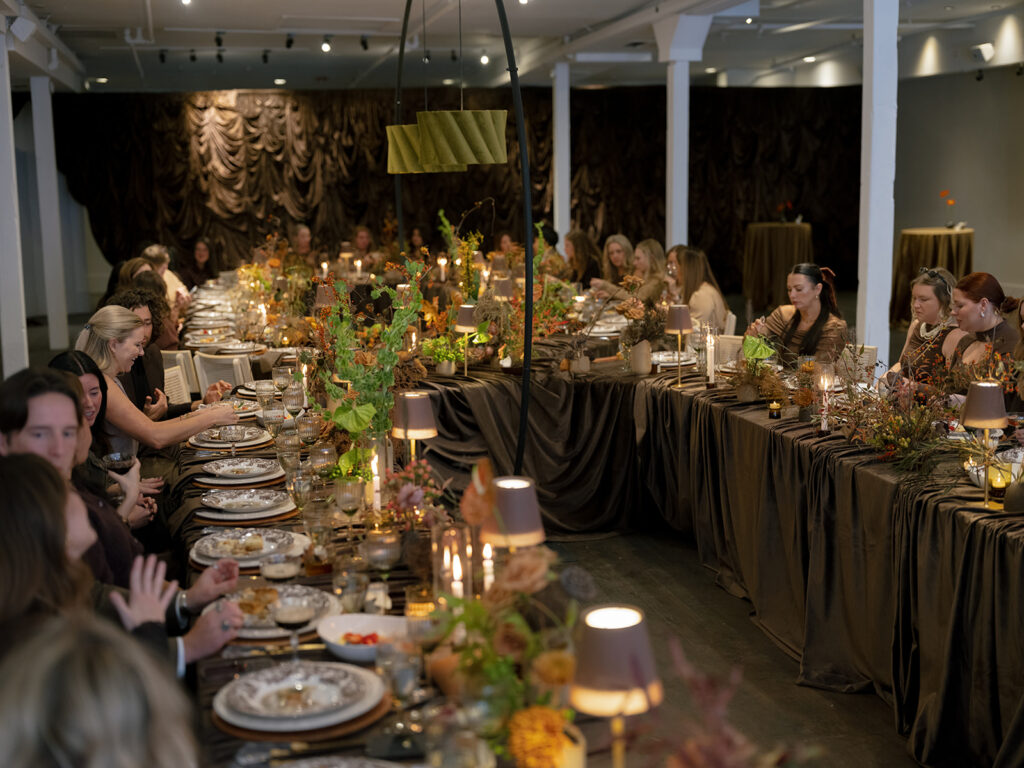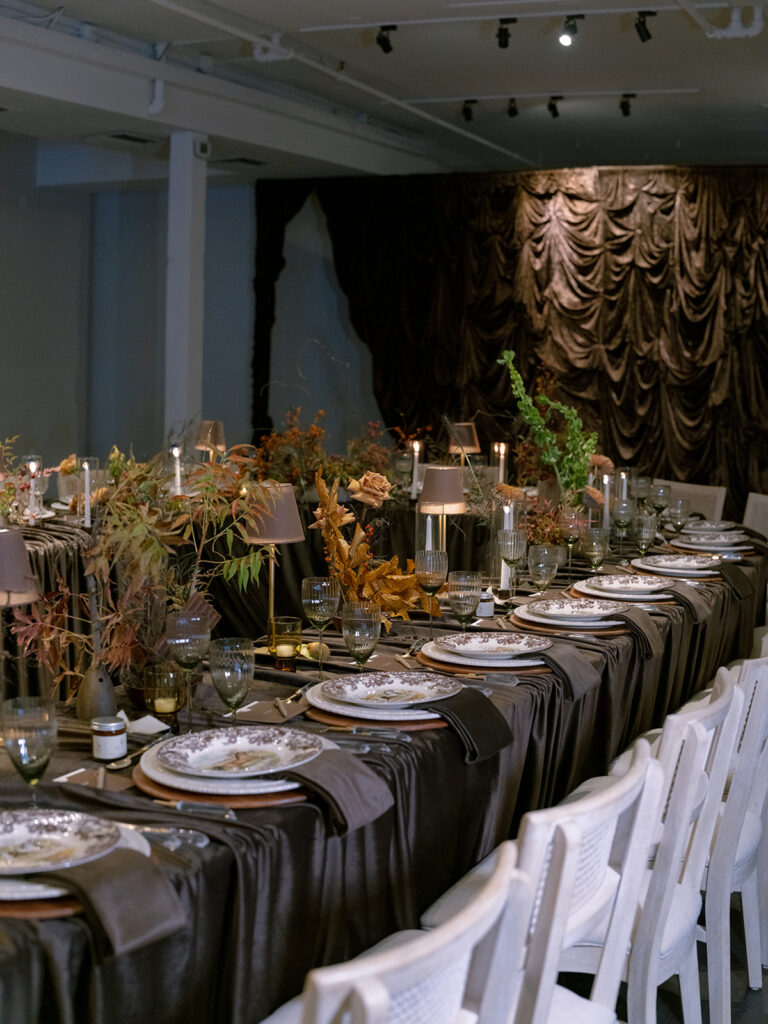 The space itself was softened and elevated with gathered brown draping, which added movement and texture, turning the room into a luxurious cocoon of color and elegance. The draping not only defined the space but also created a sense of intimacy, perfect for a sophisticated gathering or celebration.